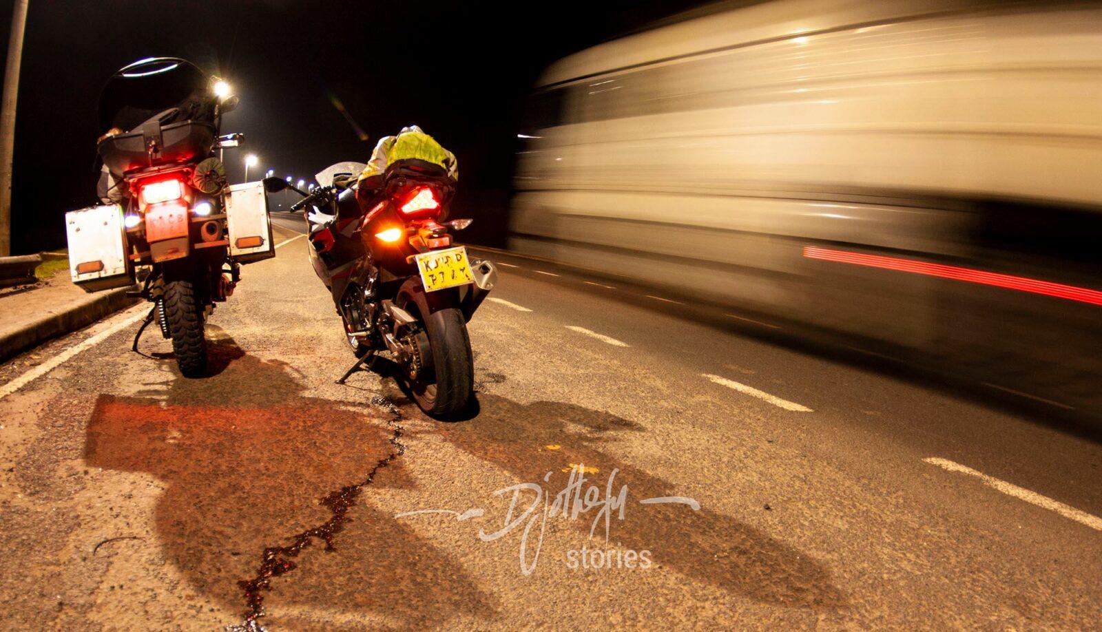 I’m starting to have trouble. The road has unpredictable sandy patches, it’s been a long day, I’m tired. My pace is now slow.